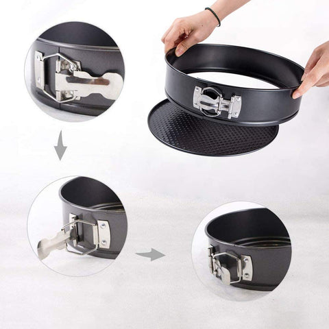 Many springform pans are available in many sizes and qualities. These cake baking pans can be opened after the dessert is done to remove the rim.