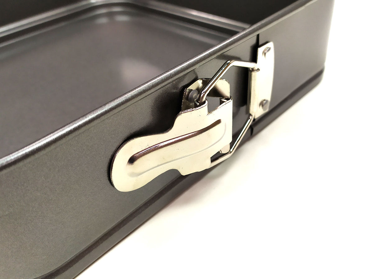 - Spring latch and interlocking which securely holds form together offering a tight leak-proof seal, ideal for the water bath, and wrapping it in tin foil is recommended.