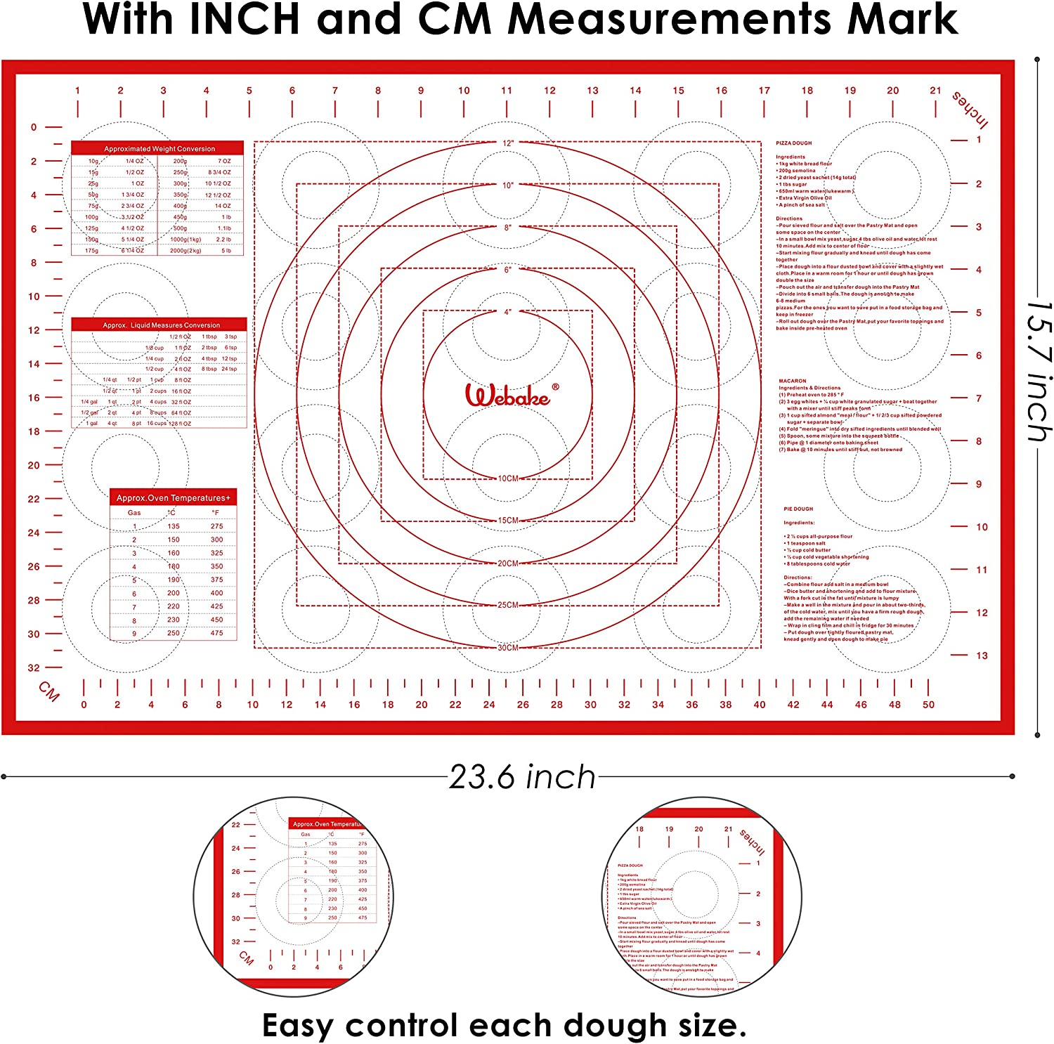 - Simple and Practical Convention Charts: Pastry mats with measurements, the circular guides make rolling out pie dough, macaron, or pizza crust a breeze. Even the least experienced novice bakers will be confident to make, roll out, and cut the perfect pie crust. Measurements are in imperial and metric to guarantee perfect results - every time.