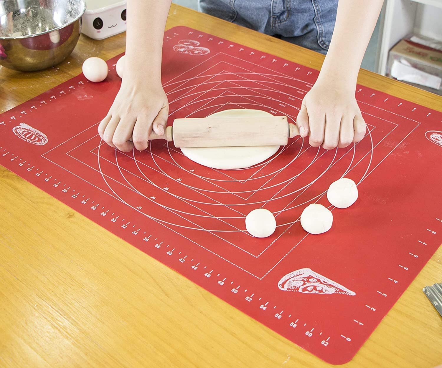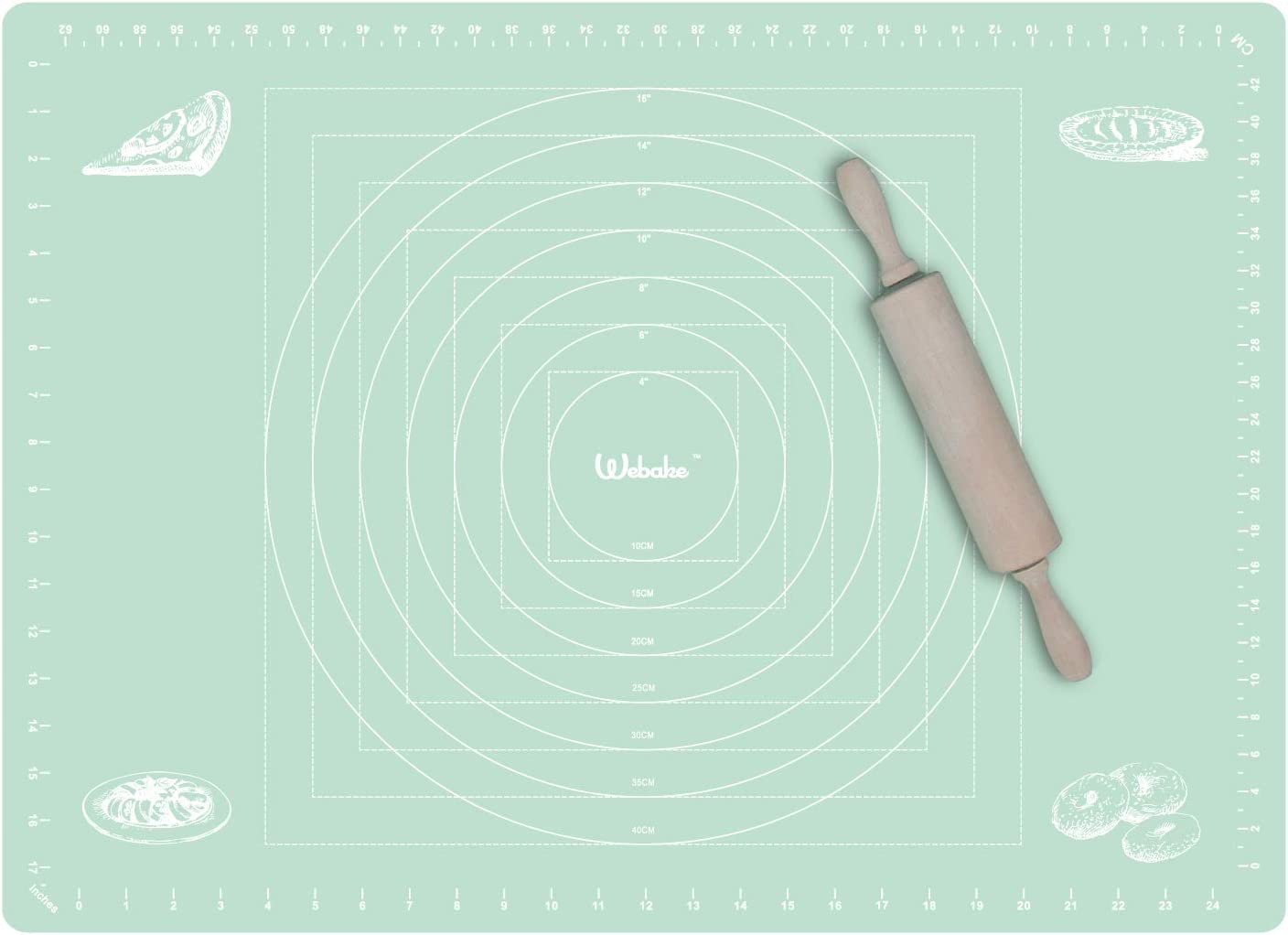 - Super Large Pastry Mat Size: 27" x 19". Fits a full-size baking sheet and big countertop, with circular and square measurements, both in inch and centimeters. Note: The package does not include the rolling pin.