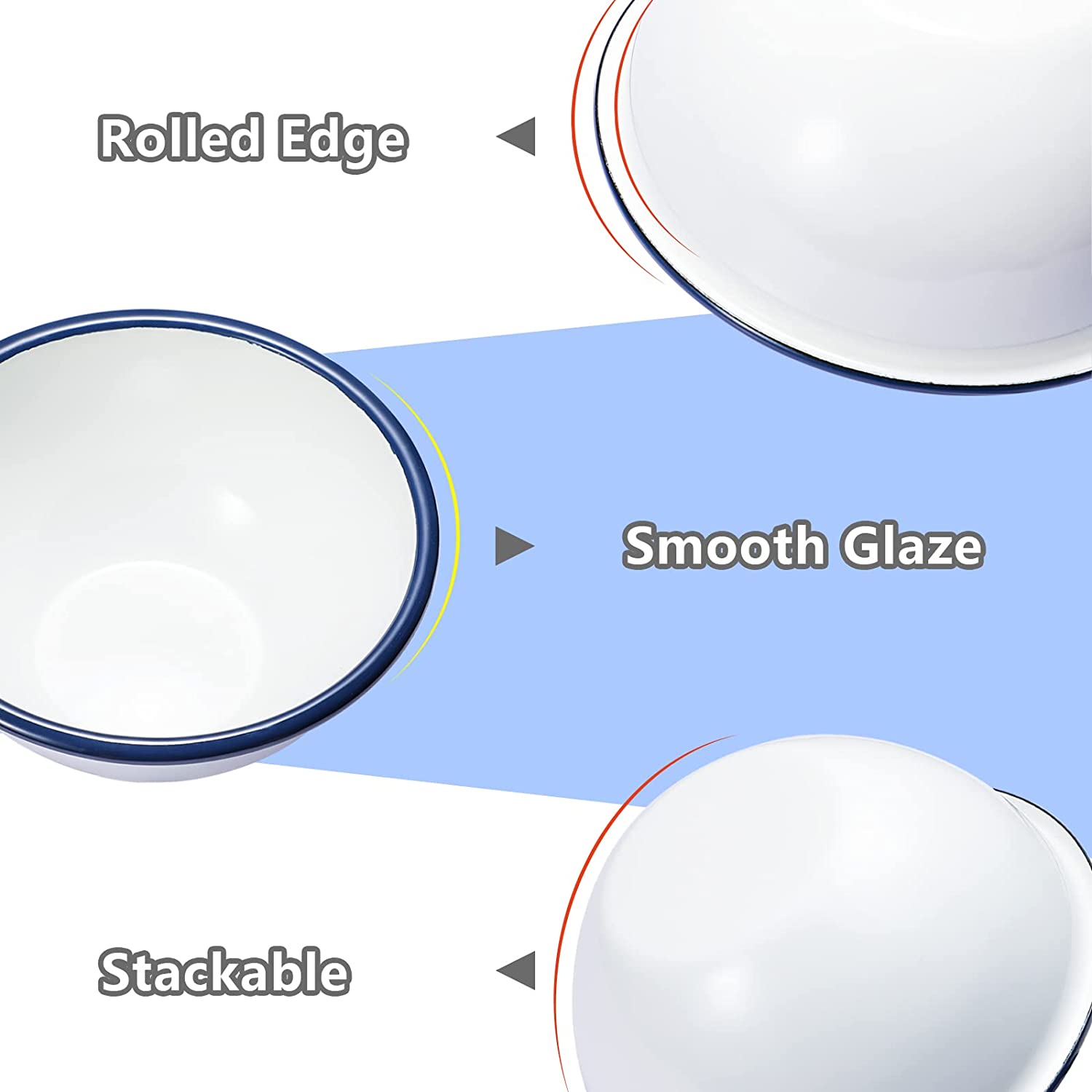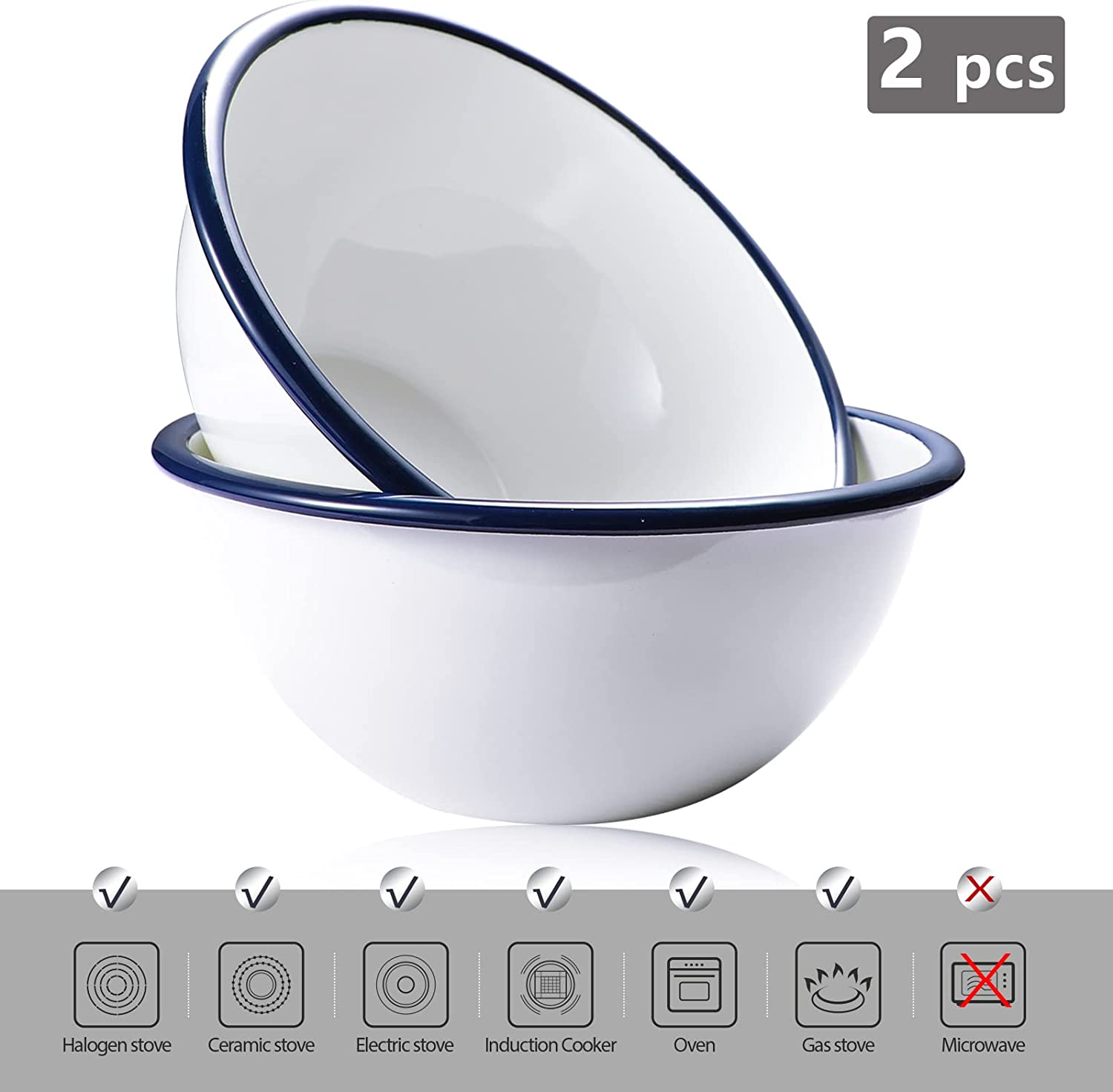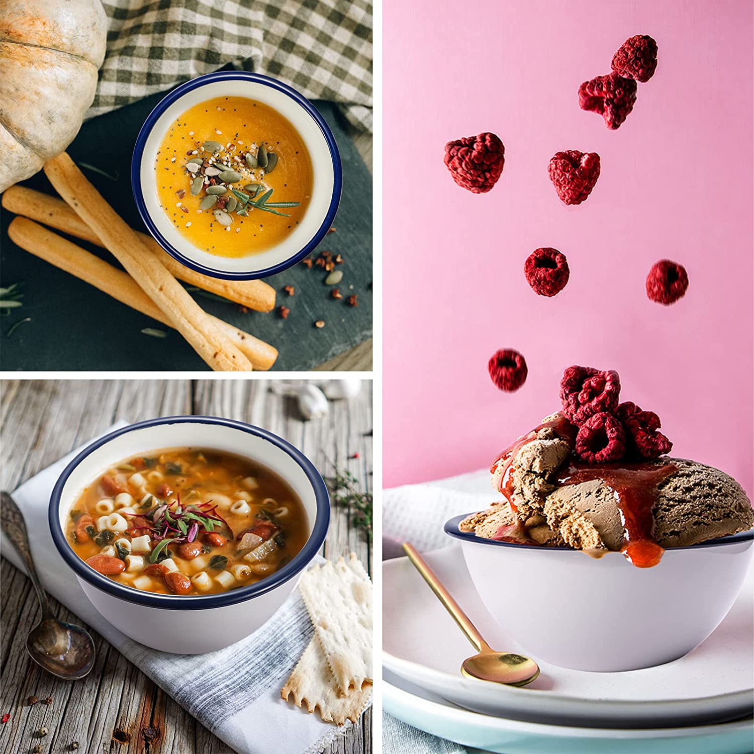 - STACKABLE & EASY CLEANING - These pasta bowls are stackable and don't take up a lot of space in your cupboard. Easy to clean, you can wash them with soap and hot water. Hand Washing is recommended. Enamelware is NOT intended for microwave use.