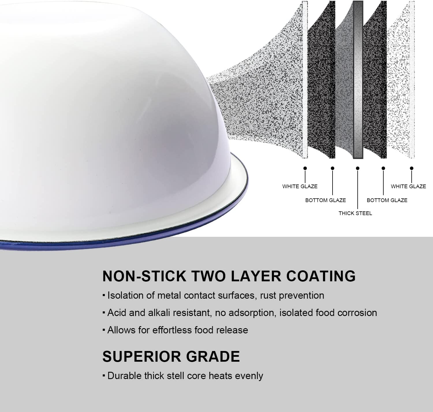 - WELL-MADE WHITE DEEP DISH: Webake enamelware round bowl is made of heavy sturdy, food-grade enameled steel for thorough, even heating and optimal cooking performance. The salad plates are coated with white ceramic coating, non-stick and non-residue, BPA-free, and provide excellent food release, and easy cleanup. DISHWASHER, OVEN, and REFRIGERATOR SAFE.
