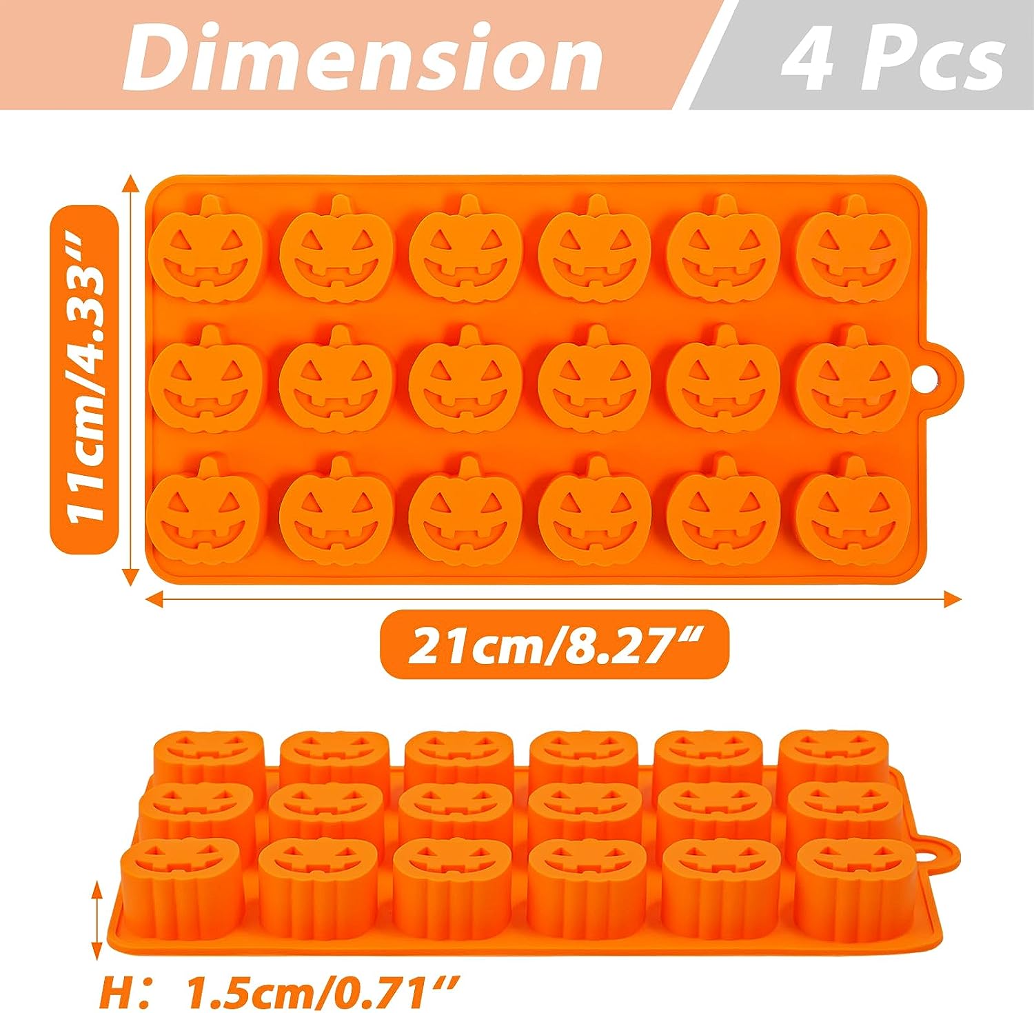 - 【EXCLUSIVE VALUE SET】4pcs Halloween silicone chocolate molds, 1*pumpkin mold: 8.27*4.33*0.71 inch, 3*chocolate mold:8.39*3.94*0.59 inch, 4 packs chocolate molds and enough cavities for you to make lots of cakes, candies and chocolates at once.